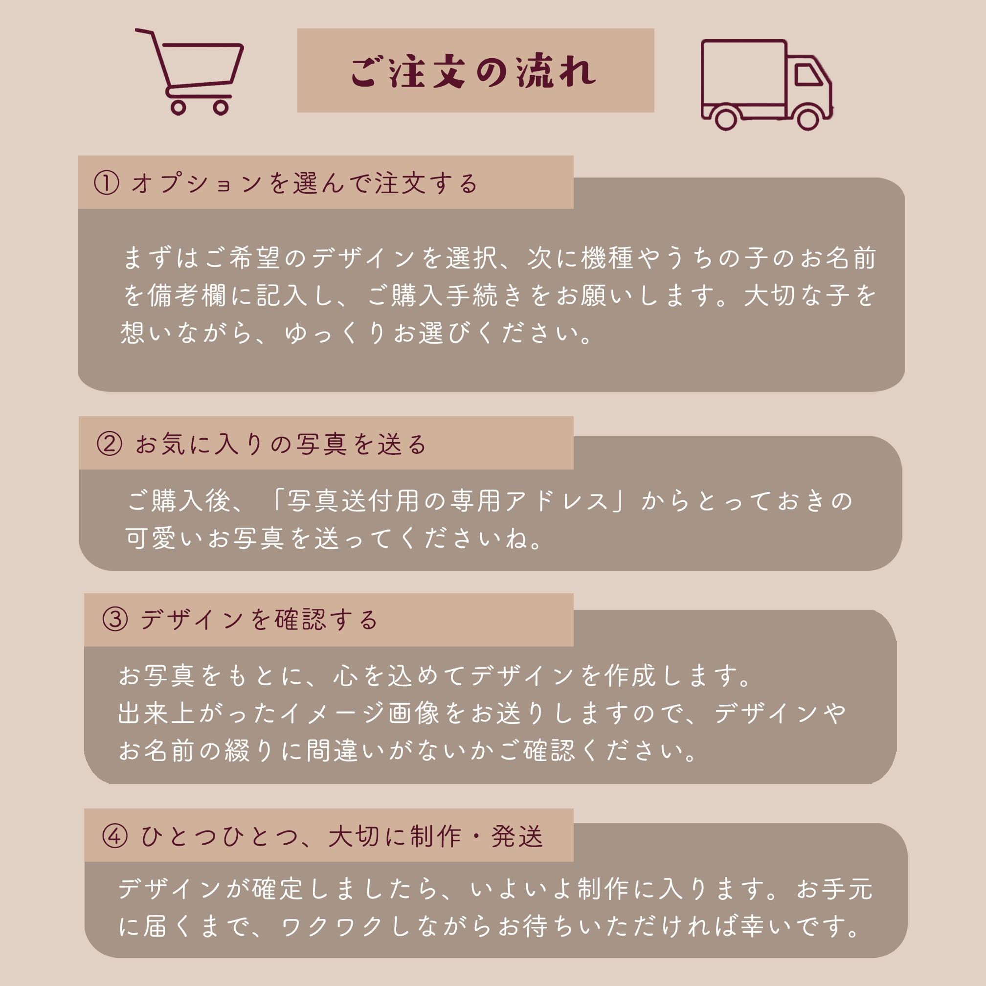 スムーズな制作のため、お早めのお写真送付にご協力いただけますと幸いです。
